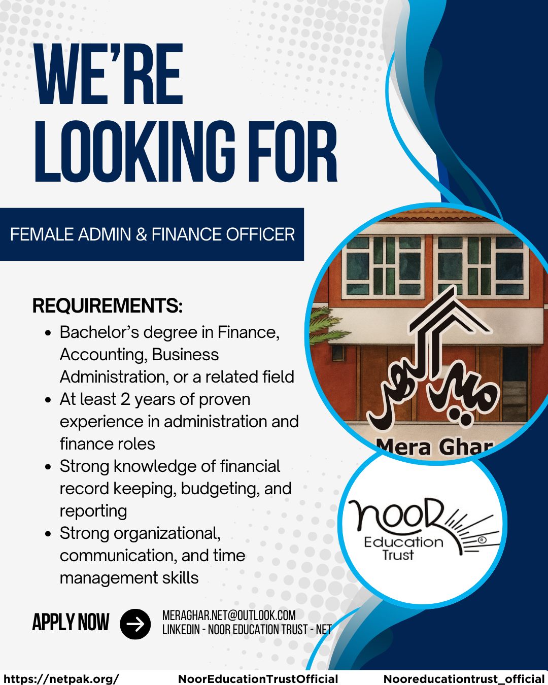 Mera Ghar – NET invites applications from qualified and experienced candidates for the position of Female Admin & Finance Officer.